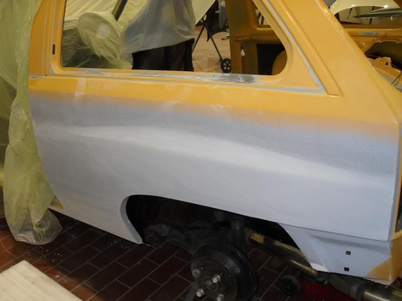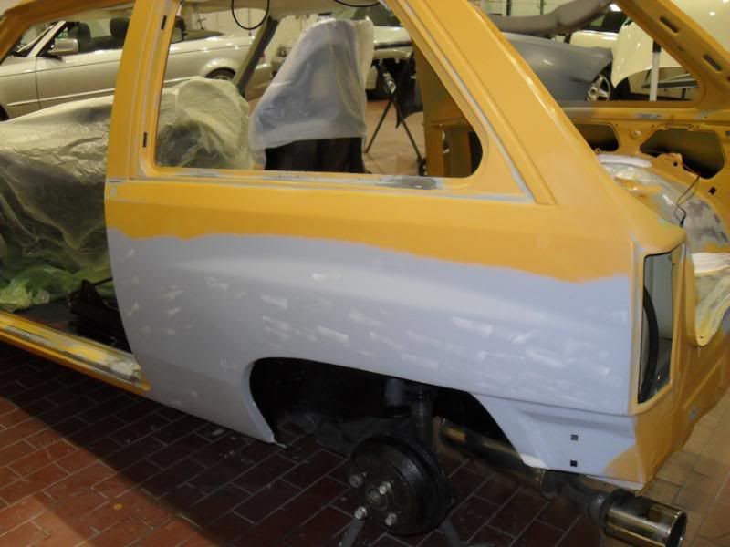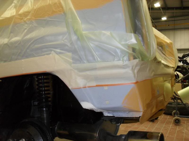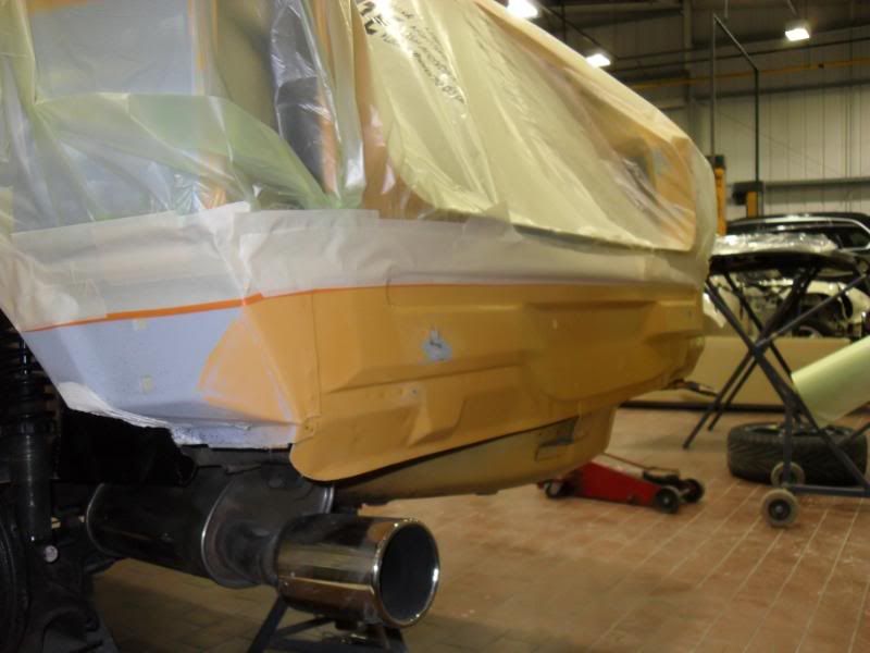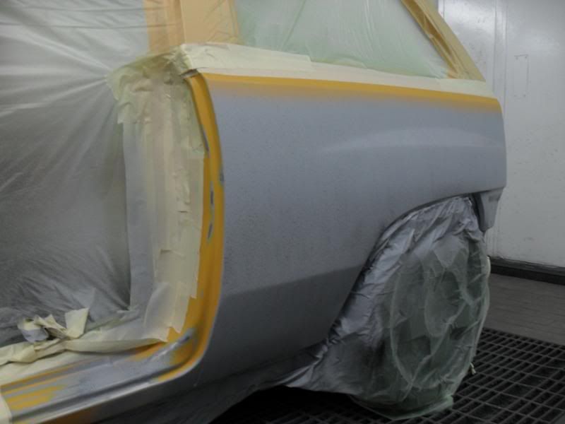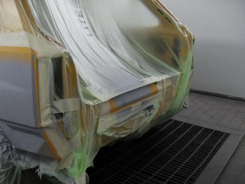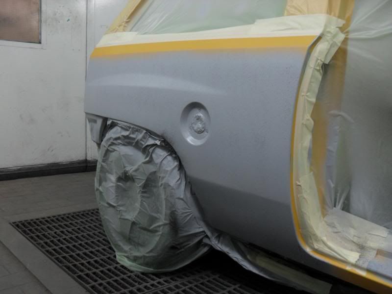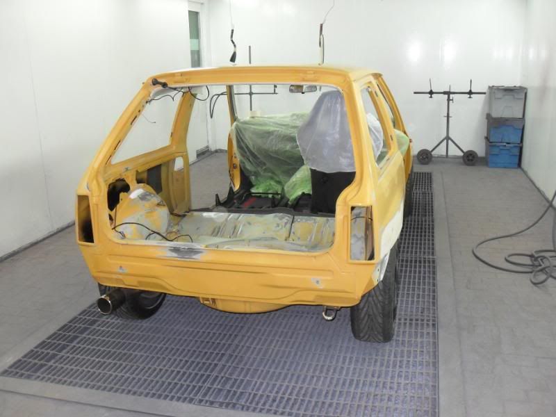 The car then went back on its rear wheels so it could be rolled into the booth for primer........