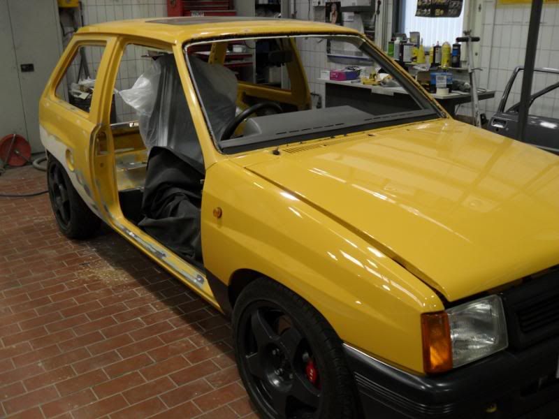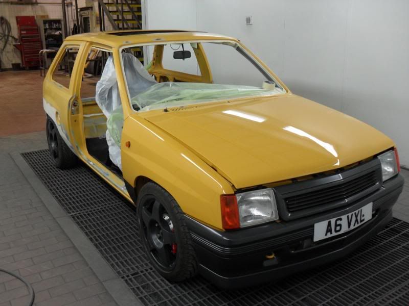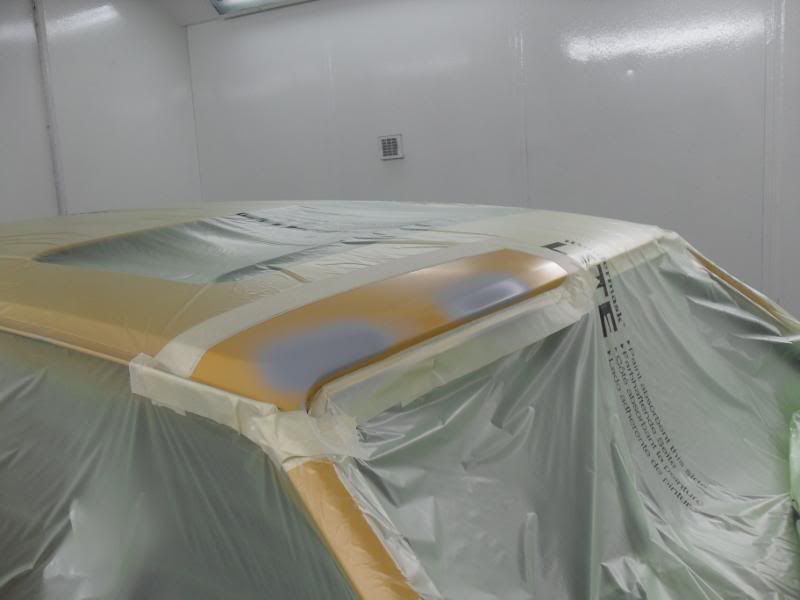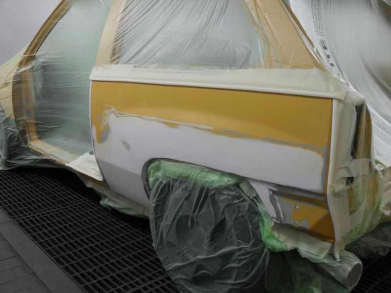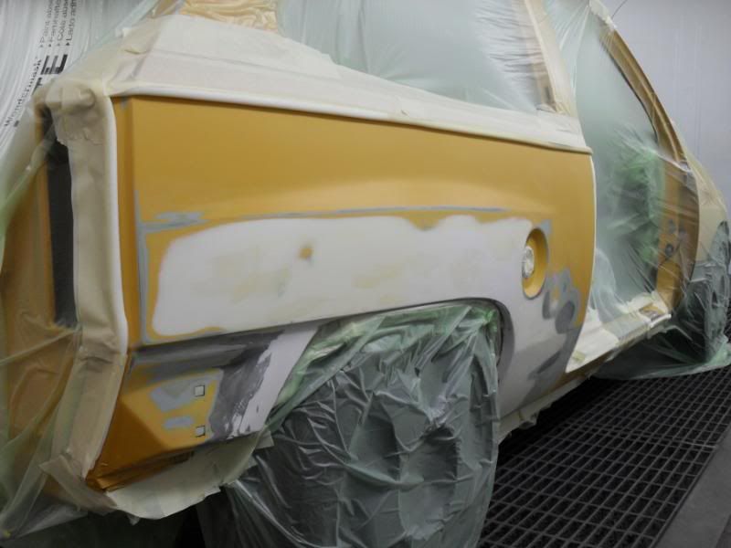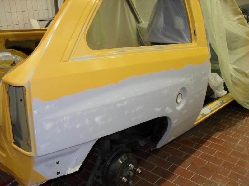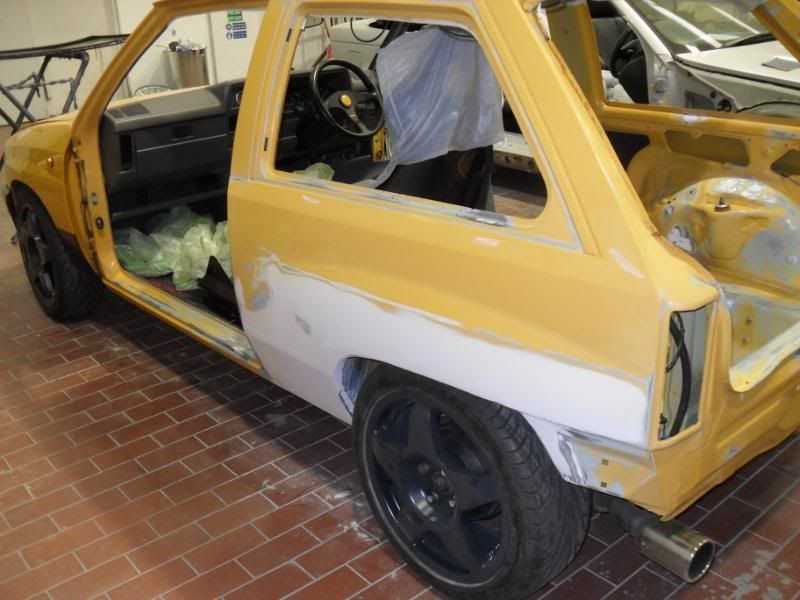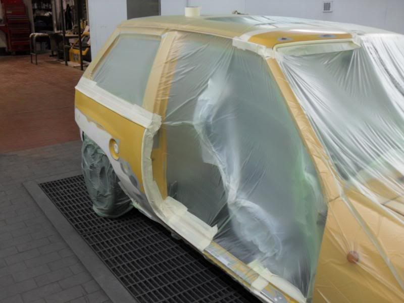 The car then went back on its rear wheels so it could be rolled into the booth for primer........