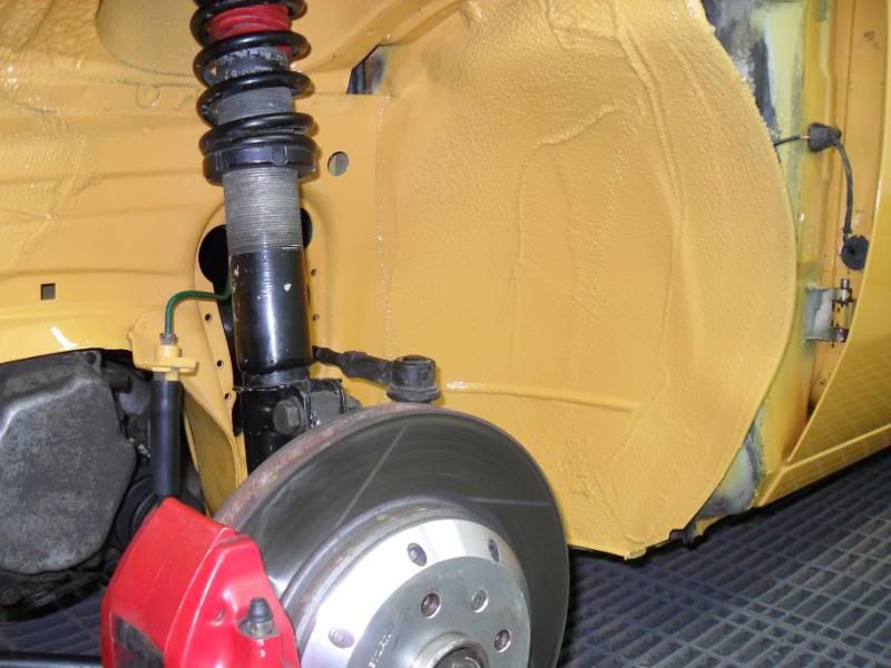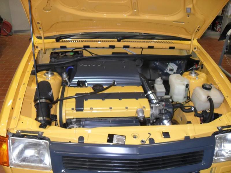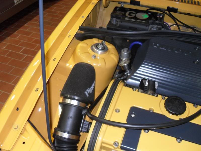 Then I was left with the headache of what to do with the bay.... I didnt want to go through the full procedure of painting the bay with the motor and box in and as the bay saw paint only a short time ago when shaun converted the car it was in great condition just a little dull for my liking. The slam panel had a few chips.marks here and there so what I decided on was to paint the slam panel but clear only over the original yellow already in the bay around the strut top areas,inner wings etc to re gloss them. The engine bay and slam panel areas were fully stripped apart from the motor/box and I cracked on. Once built back up I was very pleased with the results.......