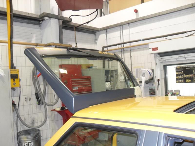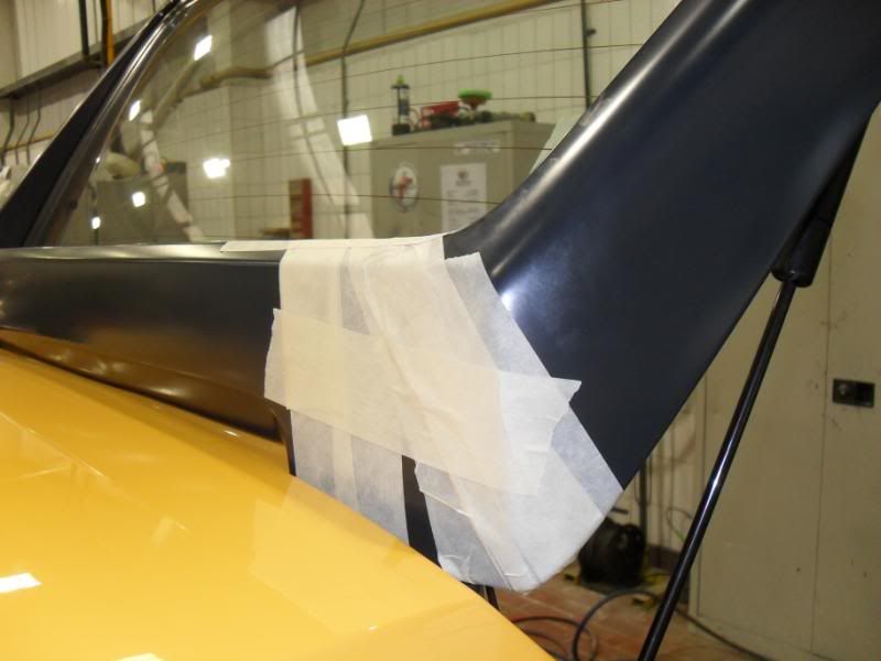 A quick halftime update after a prompting from Mr Robinson! I cracked on over the easter hols and had the bonnet finished ready to go straight back on once we were back in on tuesday. The tailgate was filled with dinitrol and built up followed by the rear screen in and spoiler on. It was actually a different spoiler to what was on the car as I pretty much destroyed the old one when I removed it! Once fitted we noticed it didnt want to sit right on one of the top corners due to it obviously being very slightly twisted and spoiler tape not being strong enough to alter/hold it in postion. So we have tried to sort this by lifting up that corner and pumping in a little spoiler adhesive then taping it down to hold it in position like so........