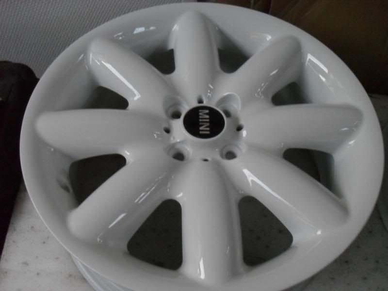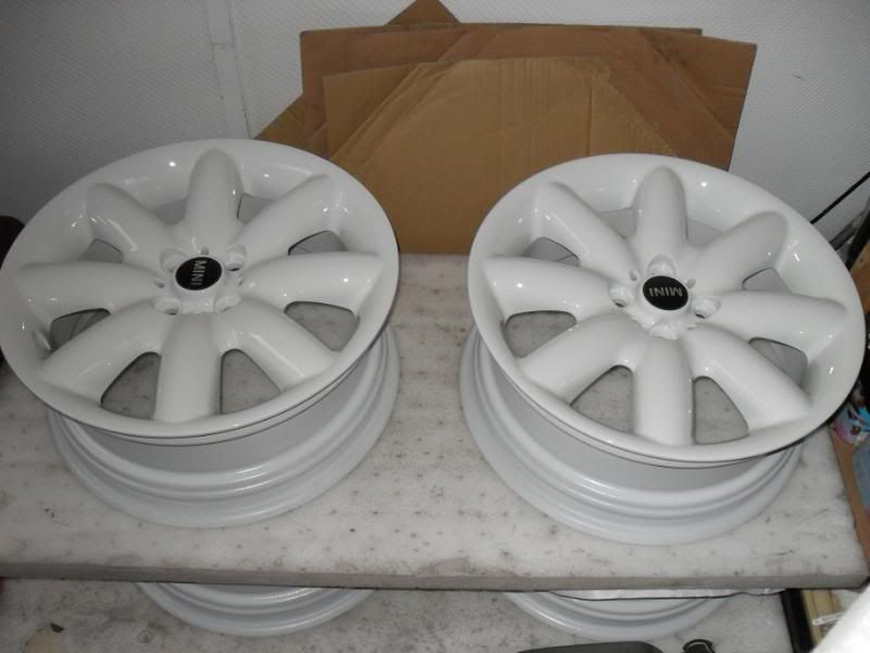 But before I go heres a little update on the recently acquired mini. as said previously I wasnt a fan of the schnitzer wheels so the hunt was on to find some genuine cooper s standard wheels. I sourced some locally for a bargain only downside being they were silver. But a refurb later and we now have these waiting to go on......