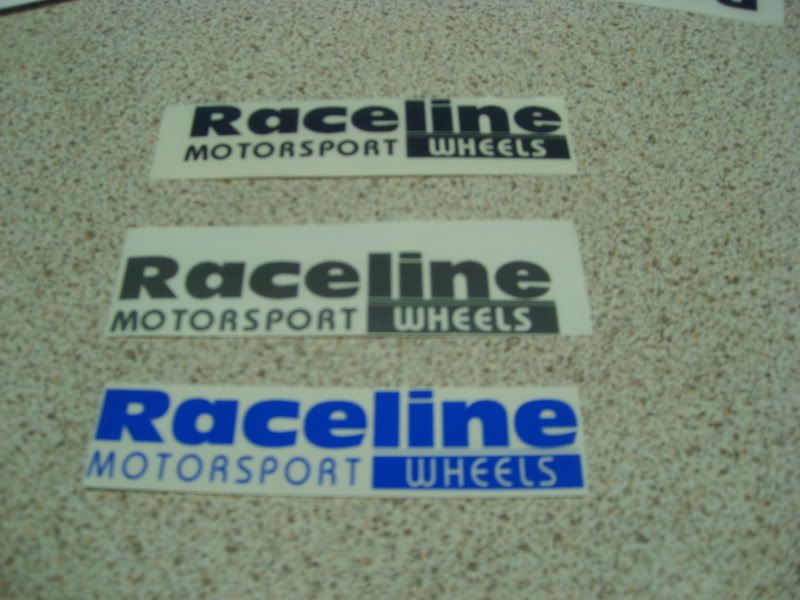I actually got some original raceline stickers when I bought the wheels but didnt think blue would go with black not on my car anyhow so I dropped by at the local printers who do a lot of custom decals on the minis for work and got these made up....... black, dark grey and original blue items, I think Im going to go with the black ones atm....