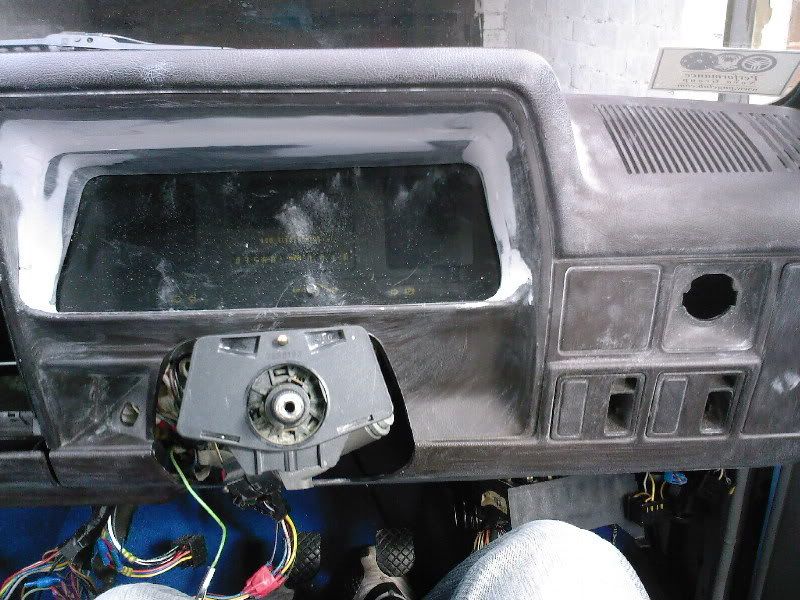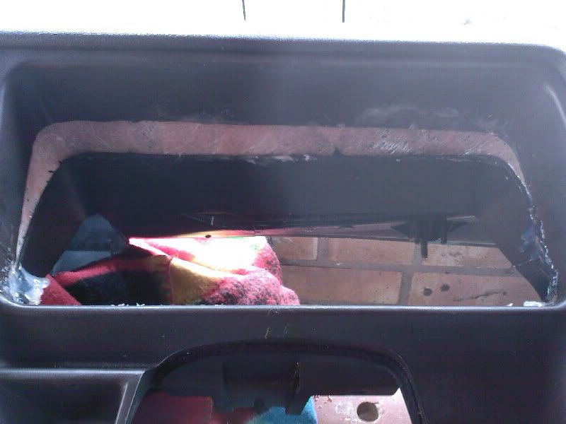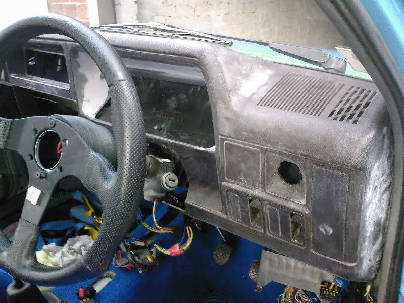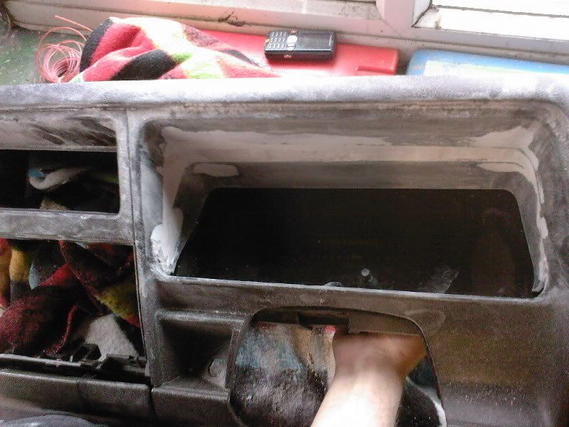 We cut, in hindsight, a little too much of the mk1 dash off and with the mk2 astra clock surround (perfect fit fot the digiclocks of course) being a bit wider than the mk1 dash binacle, we've resorted to fibreglass n filler to make it all fit nicer, smoother.... Getting it all flocked; it will be hidden and look o.e.