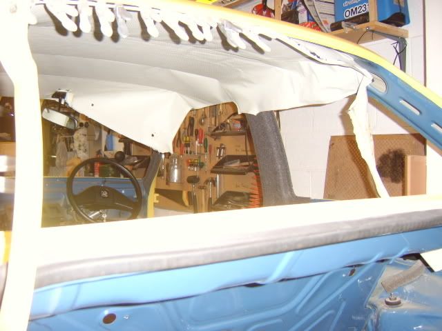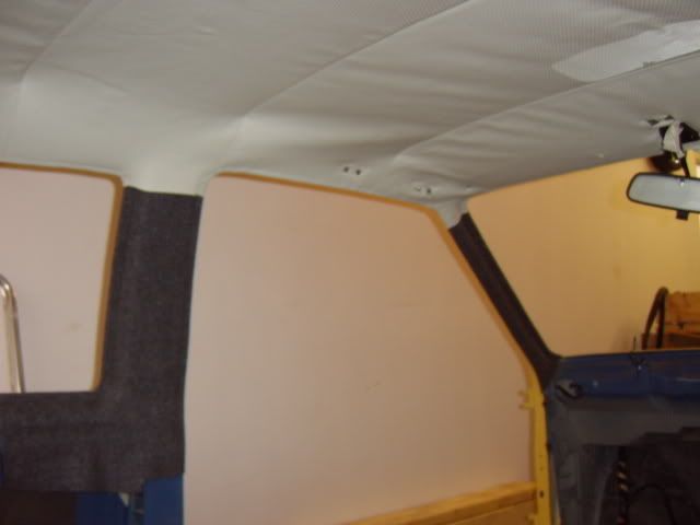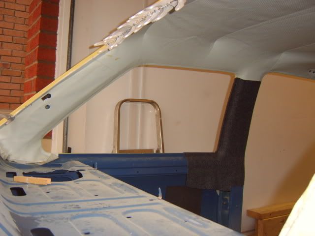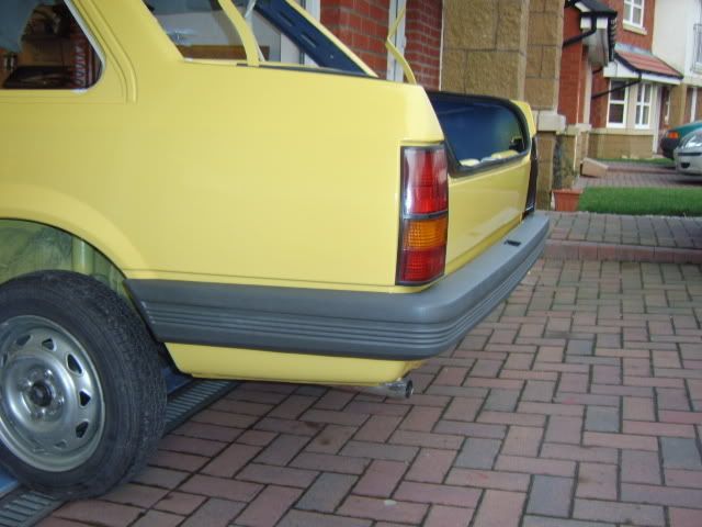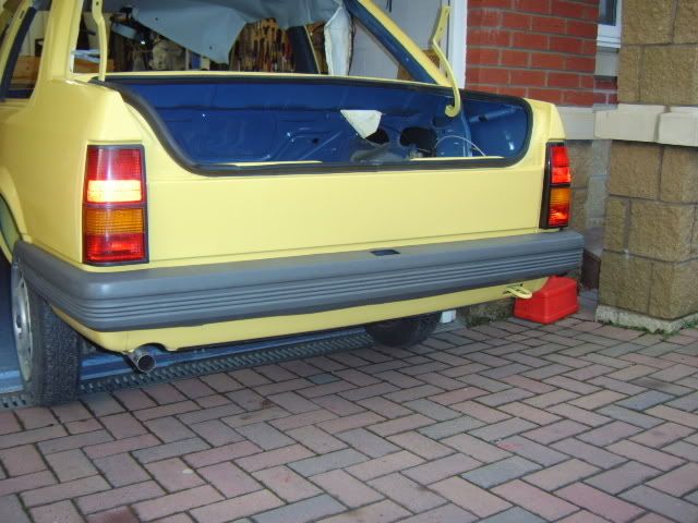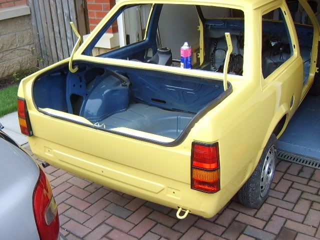 Went to collect the car at 10am on Saturday, was home with it and ready to work on it by 11am, engine was in by 12pm. Then in went the rear brake pipes & brake master cylinder, fuel tank, exhaust, pedal box, steering rack. Wiring loom went in this morning at 5am along with the radiator. Had to go shopping but got ?5's worth of fuel, back at 10am, engine was running at 11.40am after having to suck the fuel through the lines as the pump was taking forever and draining the battery due to cranking over for ages. Then onto the A & B pillar trims which is accoustic cloth, then on with the roof lining which is only fixed on the passenger side, waiting for this to dry before tensioning across to the drivers side. Will fit the passenger door rubber and rear passenger window first before doing so. Rear bumper is on along with the rear lights (cheers Steve for the Euro-Fog). Pretty much that's it so far.
