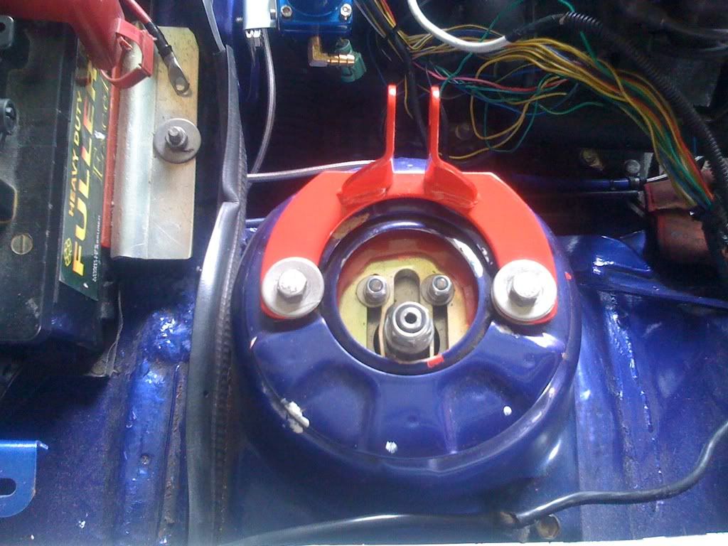 Pic of the top mounts these are not the finished job they are made so the they are adjustable at the mo so we can move them out to suit the wider track and keep the the standard kpi