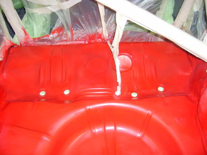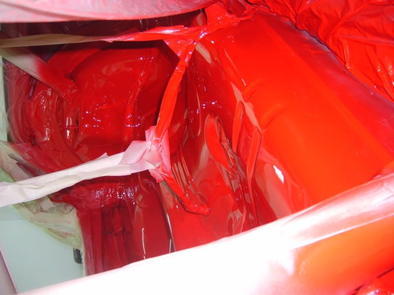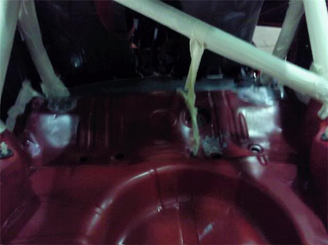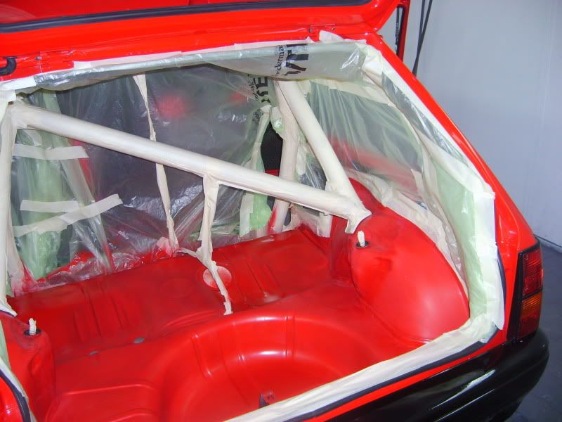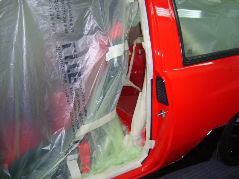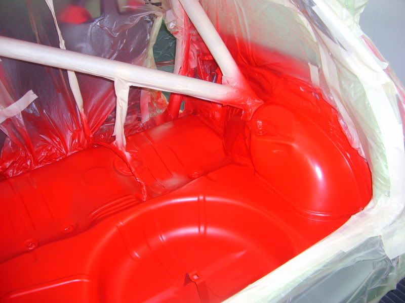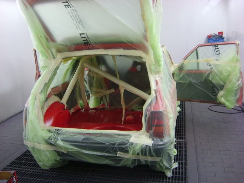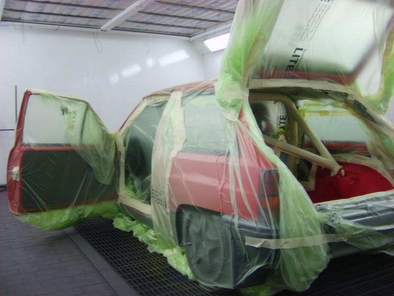 With the bracket areas cleaned up I gave them a quick coat of primer and then a few coats of aerosol red as a body up for saturday morning. Then I pulled the car into the booth and masked the inside off.....