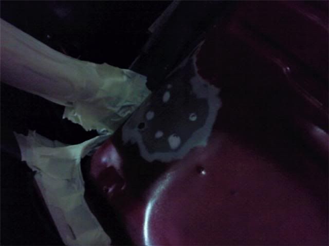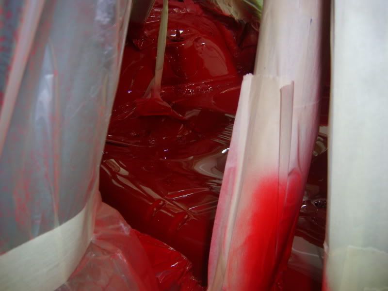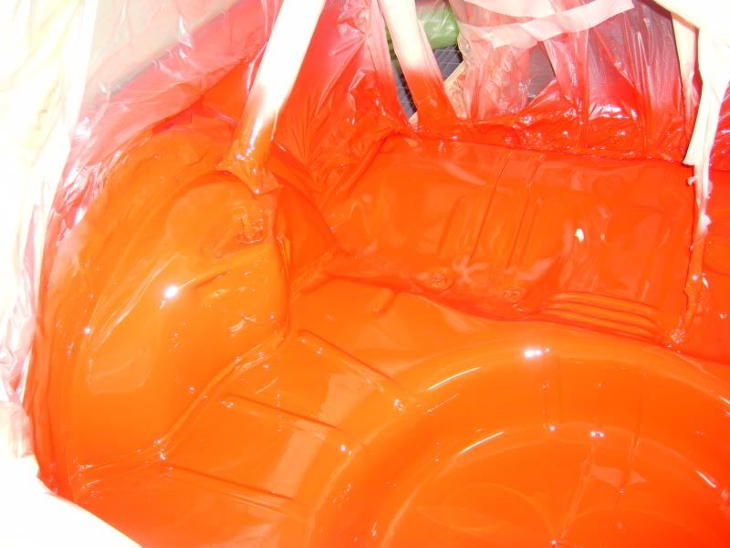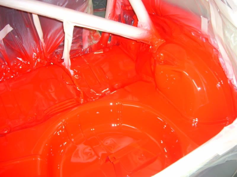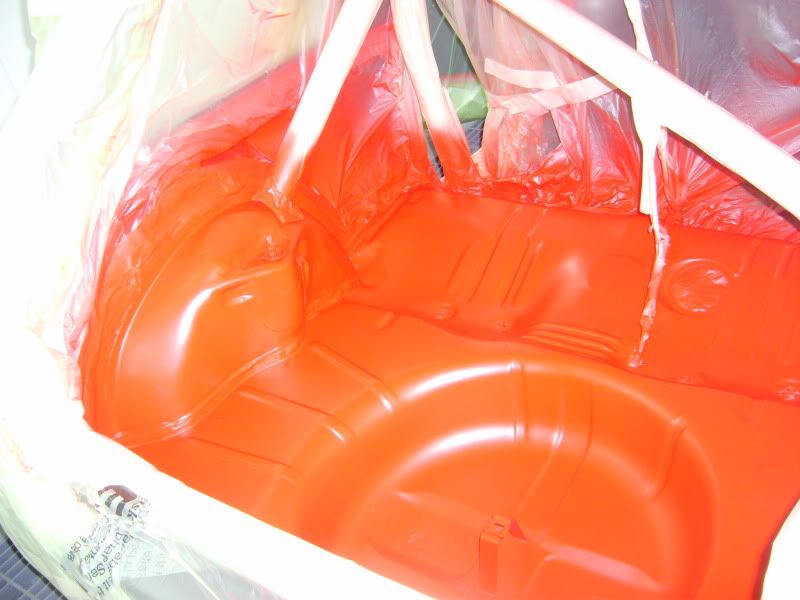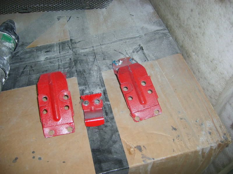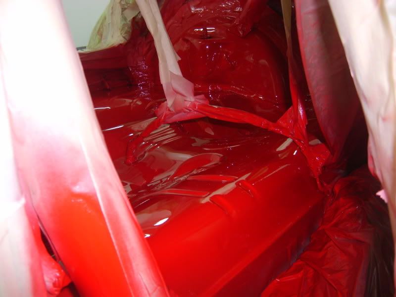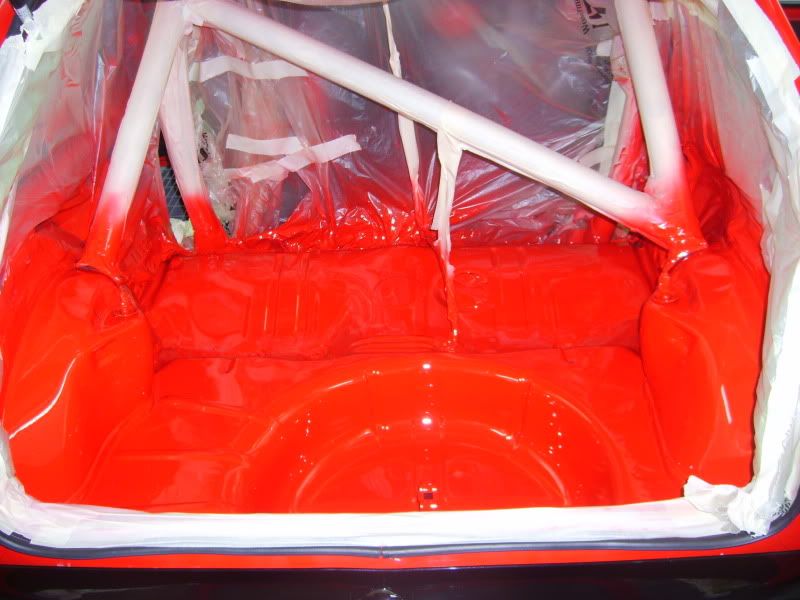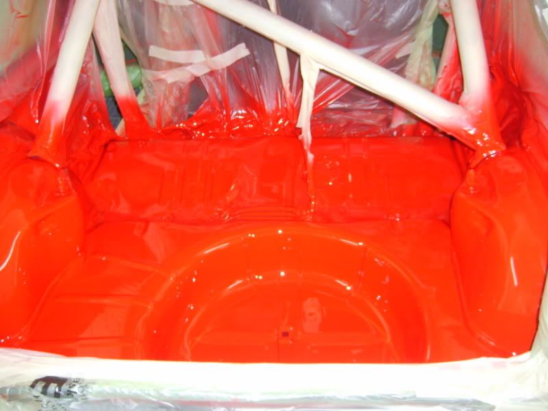 With the bracket areas cleaned up I gave them a quick coat of primer and then a few coats of aerosol red as a body up for saturday morning. Then I pulled the car into the booth and masked the inside off.....