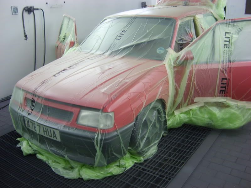 Back in work early saturday I got the rest of the car masked up and just had a quick scotch over the areas that had seen some aerosol action yesterday. (Didnt want any flaky paint later!) Once that was done a good blowgun and tack off and we were almost ready for paint......