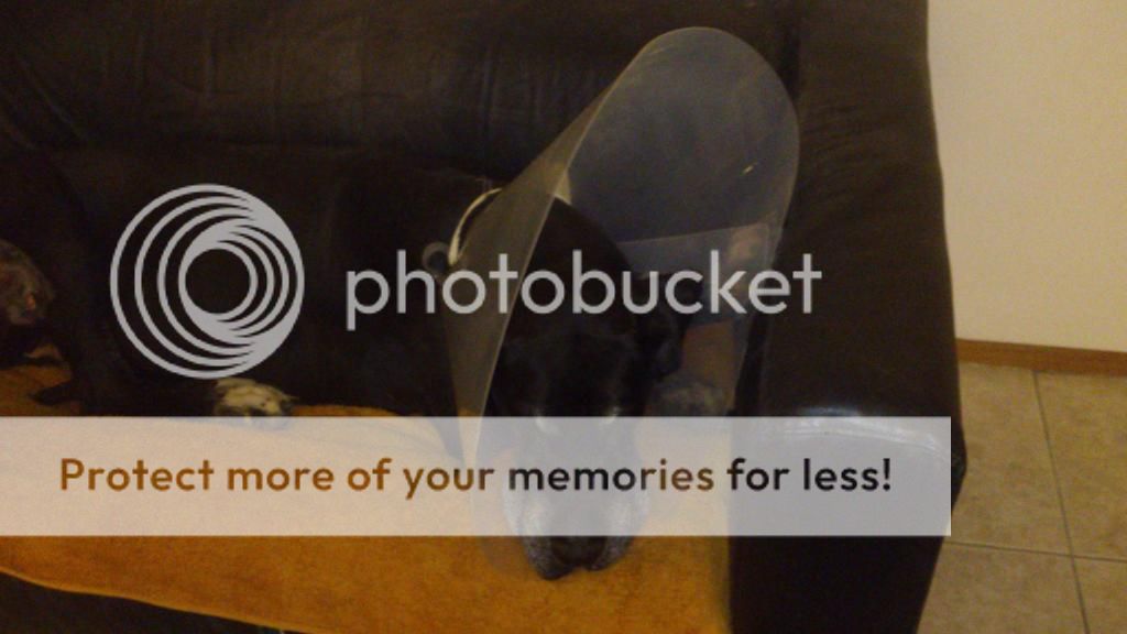 A huge collar to prevent her from messing up the stitches, a necessary evil that gets in the way when she wants to eat or drink. Must be worn for almost 2 weeks. I feel sorry for her.