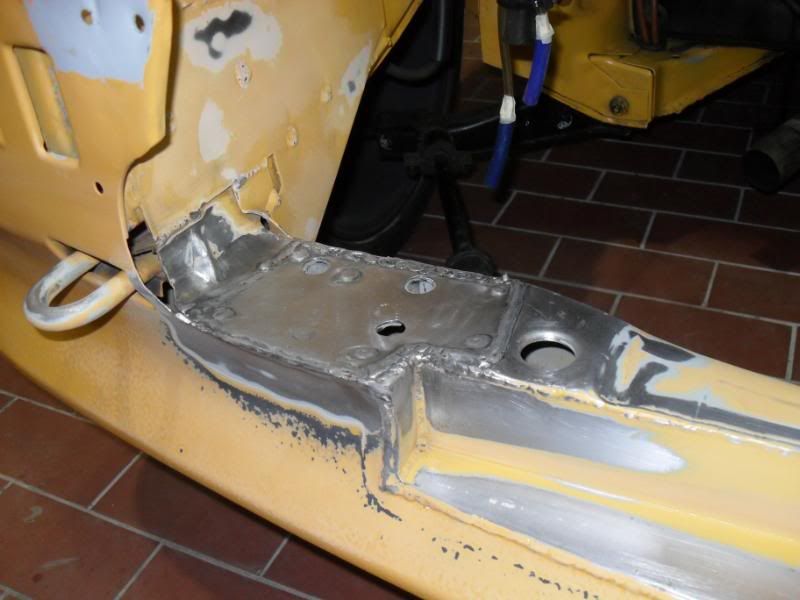After speaking with the guys to arrange and confirm a suitable booking date for the engine refit I had to get a move on with the engine bay so the car would be ready for them this coming week. So we trailored the car to work and got it into the workshop for paint last week. I started by cleaning off the etch primer I previously applied as etch is hydroscopic and attracts moisture which we dont want trapped. Whilst doing this on one side I noticed two tiny perforation holes next to the original radiator mount holes. Even though the outer skin looked perfectly clean bare metal under further investigation using a torch to look into the crossmember at either end from underneath we noticed that the inner skin around both radiator mount holes were rather corroded. With this area being pretty close to the tie bars we wasted no time in making up some templates and cutting out a small section at either end of the crossmember to repair this. As I was on a tight schedule anyway extra work wasnt needed but big thanks to my foreman Mark for cracking on and leaving me with this..........