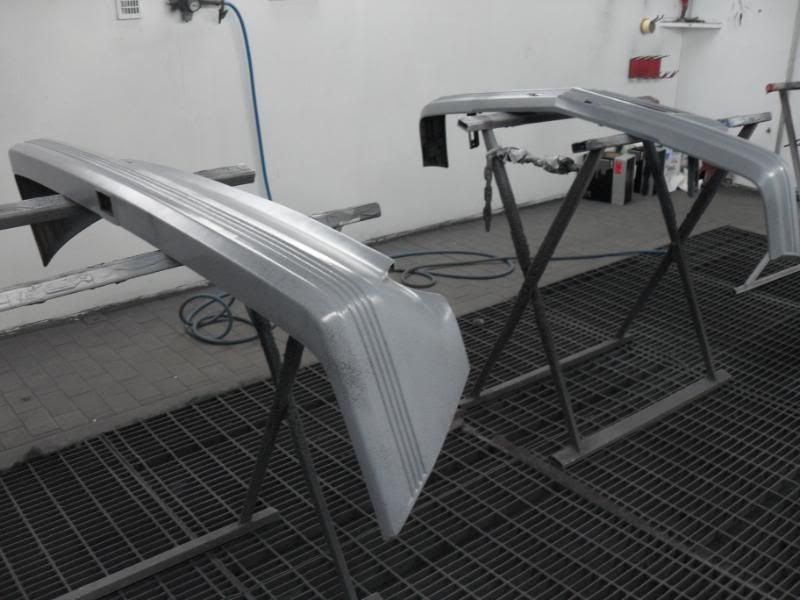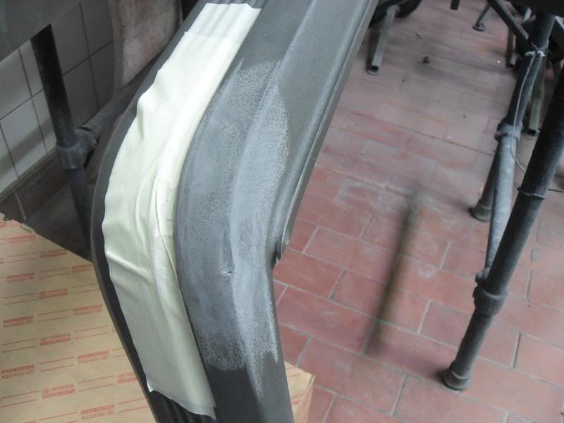 Now I was going to re texture it and find a similar colour to paint the corner in but Ive never really liked textured bare plastic so I made the decision to go smooth. The bumpers were then baked to remove any release agent and then degreased before I hit them with plastic primer.......