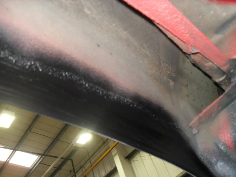 Once I was happy all repairs were completely level I stoppered up a few pinholes and had the car back on stands at the rear for an overpaintable stonguard to be applied over the sealer inside the rear wheel arches.......