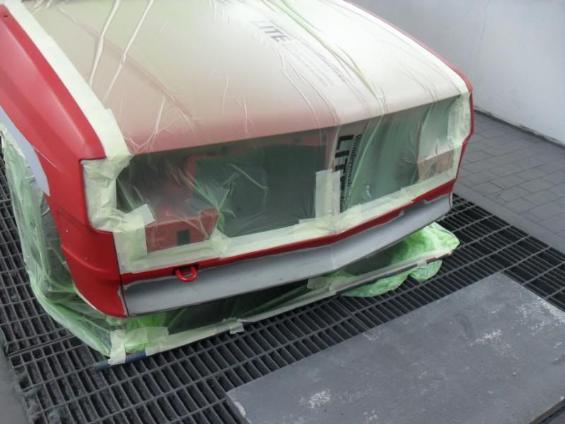 After all the primer was flatted I got the car degreased and masked up in the booth. As usual I spent quite a while backmasking so no edges are visible afterwards. As the quarter repairs were kept to a minimal area it allowed me to keep the paint to the swage line instead of doing the full panels. By the time the edge left by the foam tape is flat and polished it will be invisible anyhow. Here it is in the booth almost ready to go...........