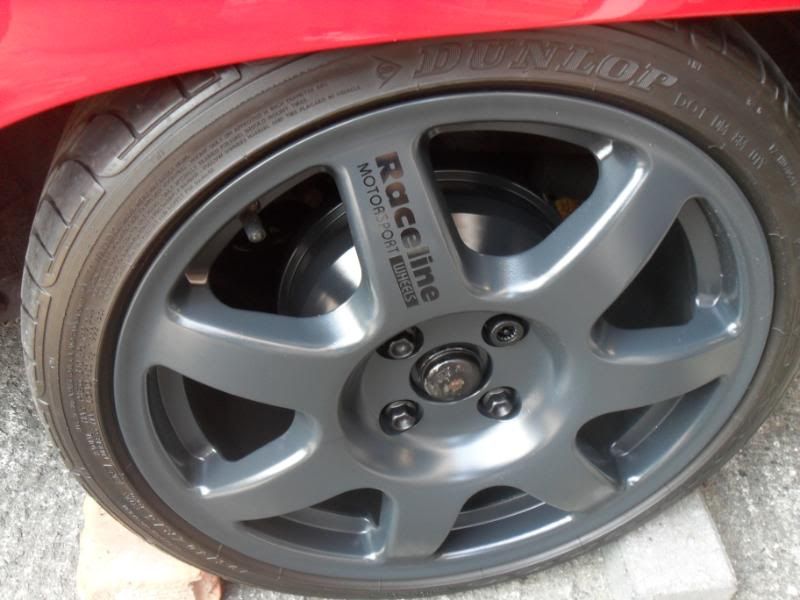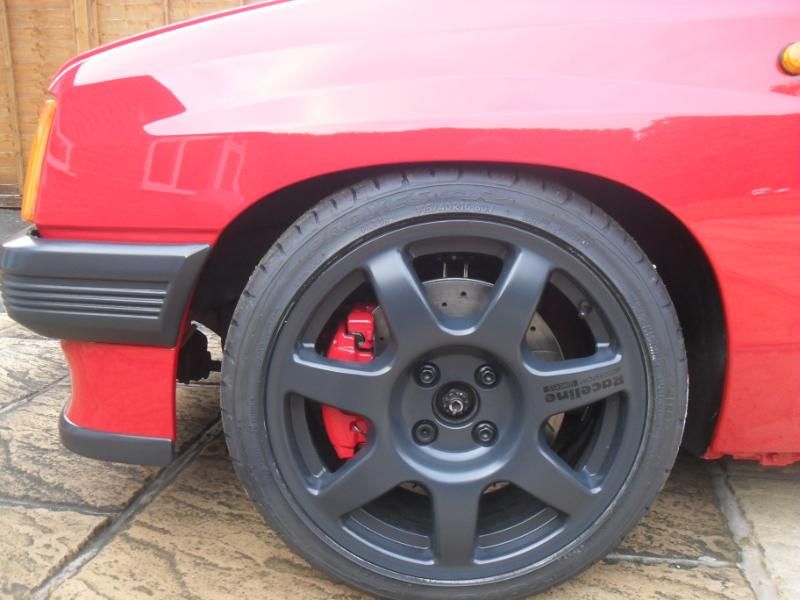 Sometime ago I purchased some rebuilt v6 calipers/meriva disc combo from Mike. I got cracking taking apart the calipers before nitromorsing them to later prep,prime and paint them in carmine red. The discs centres/edges were cleaned, prepared then primed before being finished in silver. Id also acquired an excellent gsi servo and some goodridge braided flex hoses to much improve the front brake setup. Cosmetically some black receline decals have also been added to the wheels heres how it all looks.......