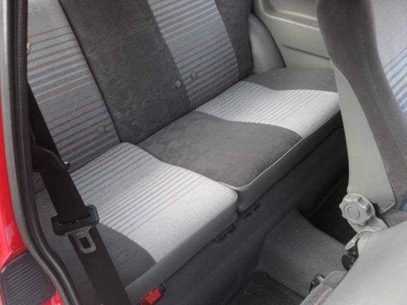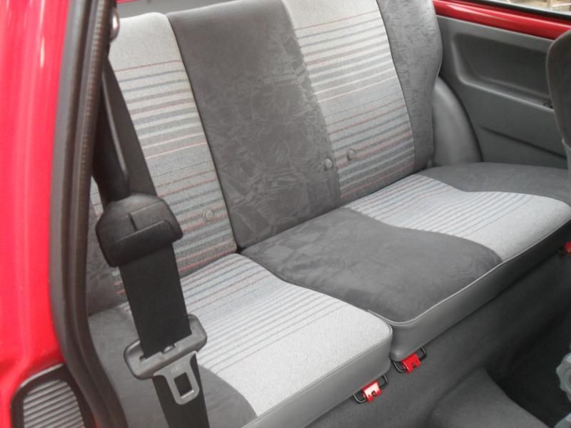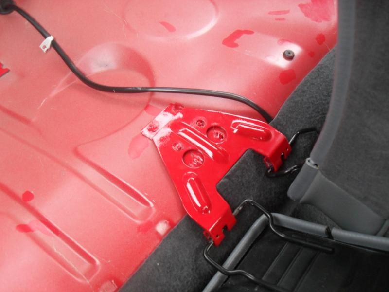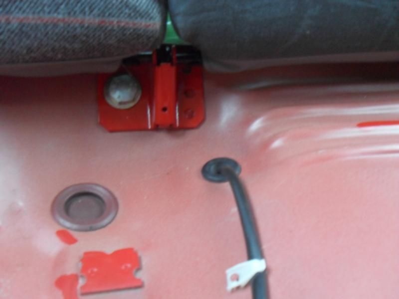 I later sourced the rear seat brackets from a gsi project of Phil lofthouses who wouldnt be needing them. Big thanks to Phil who relieved his shell of the needed parts of floor section that the brackets were on! I had one of the panel guys from work very neatly seperate the brackets from the floor section so they could easily be re used. I then cleaned them up and painted them in carmine red. Now as many of you know the rear bracket can be easily bolted in but the front one needs to be fitted via weld/rivets or run completely without the front bracket as Ive seen some do in the past. However I wanted it to be done neatly and properly so thought out my options and one of the guys from work came up with idea of using a proper 2k adhesive bonder to effectively glue it down. Now I know this may sound dodgy but the product we used is the same gear we've been using to fit Bmw roofskins/quarter panels for years and it sets like concrete and is the official repair method/product so Im sure it would suit a bracket that doeant really take any load. So with the rear seats in position I could mock up exactly were the front bracket needed to be marked it out and rubbed this area back to bare metal. The rear of the bracket was treated to the same and the next time we had a car in for a quarter I used a little left over product to glue the front and rear brackets into position and left a heavy weight on the front one overnight so it didnt move. With the brackets succesfully in place the only last thing to sort was a smaller bracket that sits in the centre/left of the rear bench area. This sticks up and prevents the rear bench sitting down fully as you can see in the picture above on the left side. To fix this I cut the top off it then ground/sanded the remainder until it was flush with the floor and finished by re painting it. Below you can see how they look........
