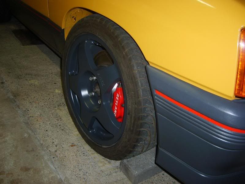 Please ignore the colour you see here as it looks nothing like the above at all! My poor quality camera/skills! A few days after paint they were dropped back off at the tyre shop to have tyres refitted/balanced etc. Then I got them onto the car so Joe could take away the allesios. No full side shots as yet but heres a taster shot showing the colour I picked matches the original bumper colour rather well, You wouldnt believe thats the same colour as shown in the above pics!...........