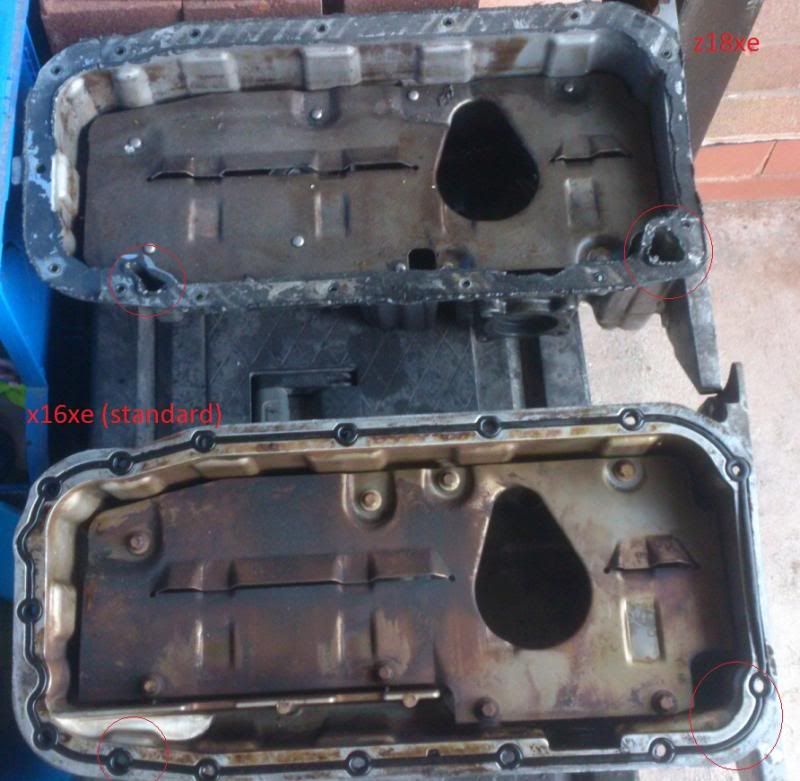 So I took it off and decided to look to going back to the original Z18XE one - but it would also need modifying to fit around the BTB manifold I was running also to be shallower; the same depth as the X16XE sump.. which is why I used the x16xe sump in the first place. It was thought the circled in photo oil drain ways were a cause as they are positioned over the flange and gasket on the X16XE sump. In addition, I had been running the X16XE sump without the top baffle/crank scraper.